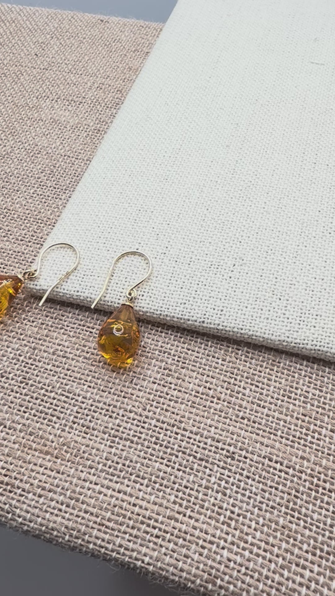 Handmade in Poland 14K Gold & Cognac Baltic Amber Pear Shape Earrings – Lightweight Everyday Amber Drop Earrings
