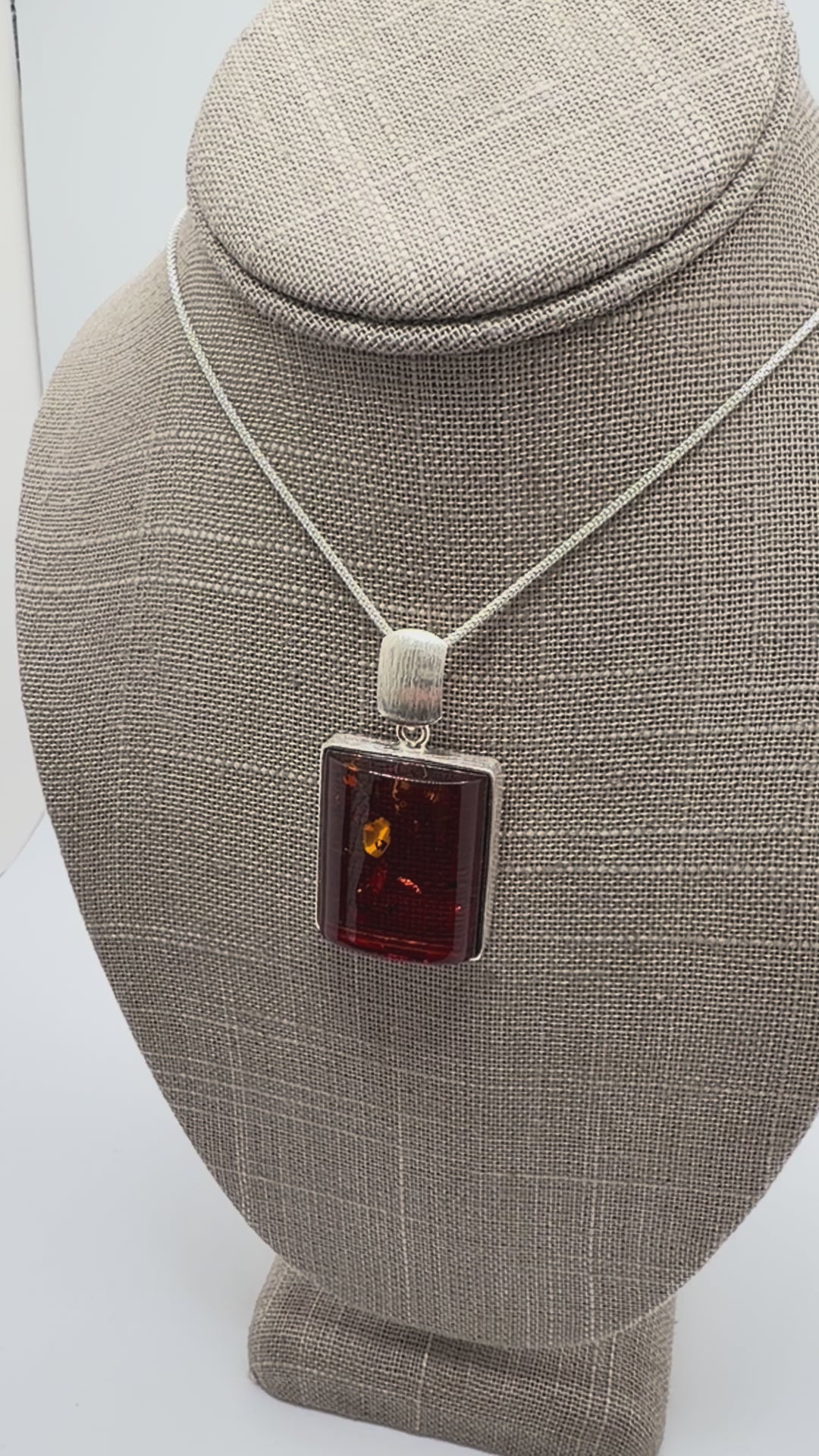 This elegant, modern pendant is handmade in Poland from genuine cognac Baltic Amber and brushed sterling silver. The sleek rectangular design perfectly complements the warm honey tones of the amber, creating a striking balance between organic beauty and modern sophistication. The brushed silver surface enhances the contemporary aesthetic, while the amber glows beautifully in the light—capturing that classic Baltic warmth.