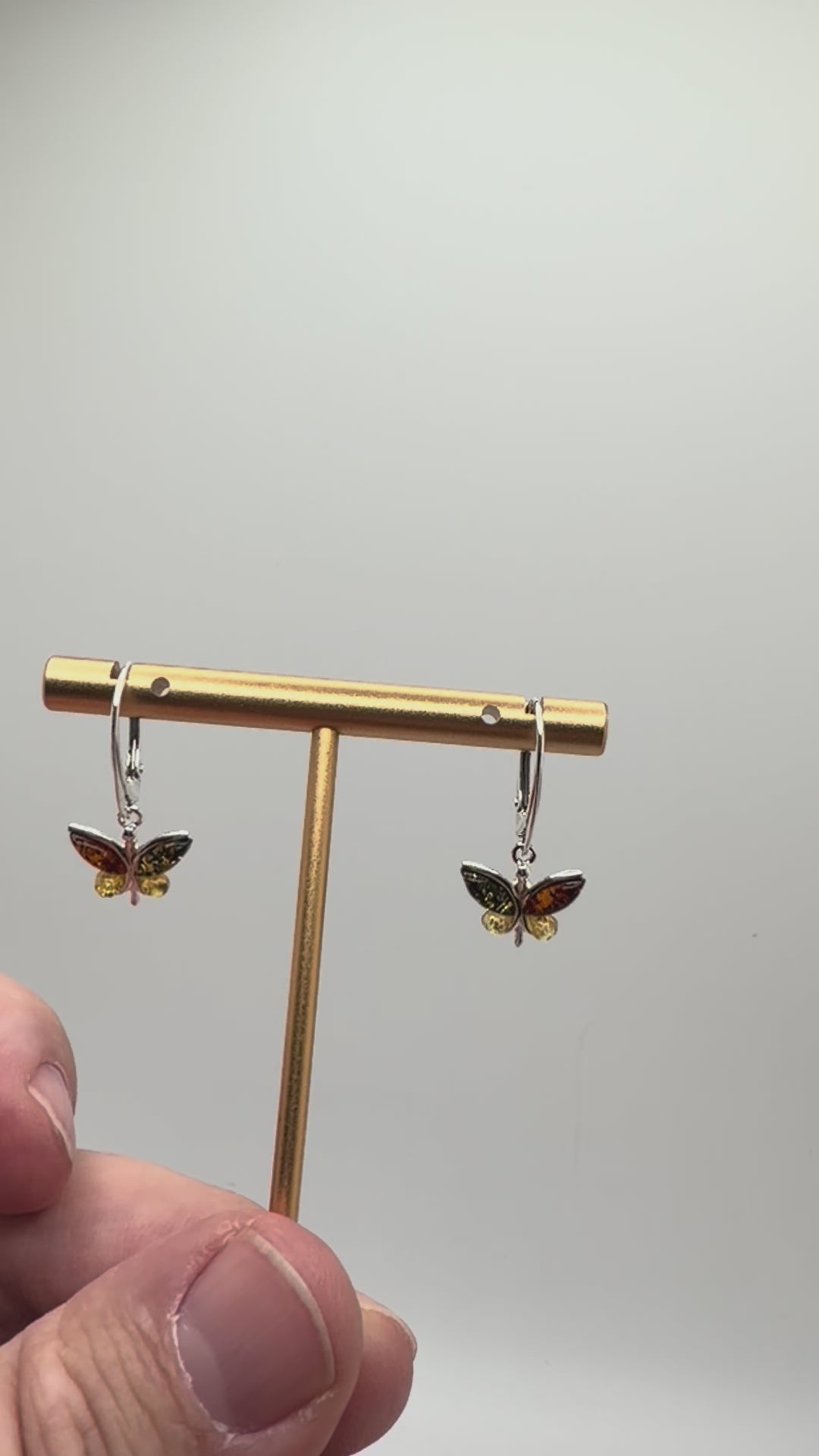 Handmade Sterling Silver Multicolor Baltic Amber Butterfly Drop Earrings | Honey Green Lemon Amber | Lever Back | Whimsical Polish Design