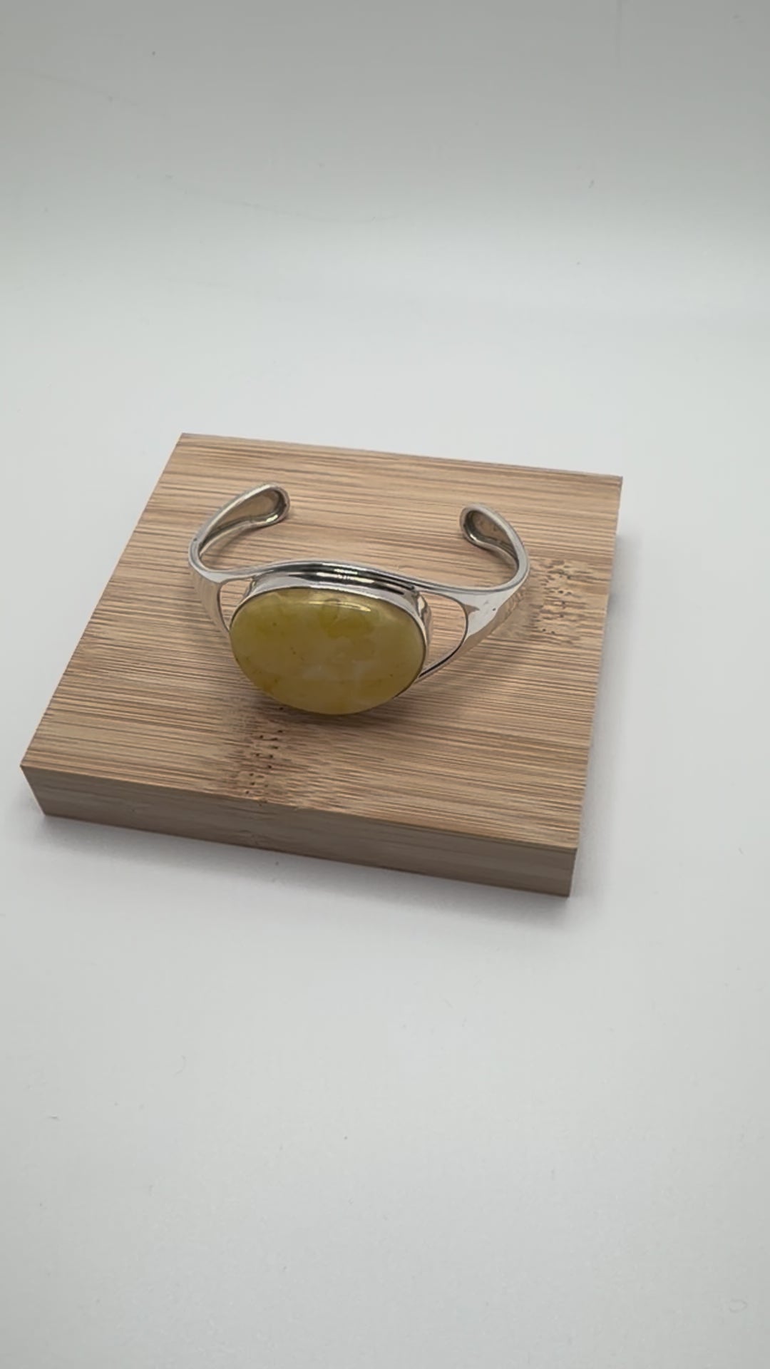 The large amber cabochon, measuring approximately 25 mm x 35 mm, radiates a warm butterscotch yellow glow, with natural inclusions that make each angle mesmerizing. At 26 g total weight, the bracelet carries a bold and luxurious presence while remaining comfortable for wear.