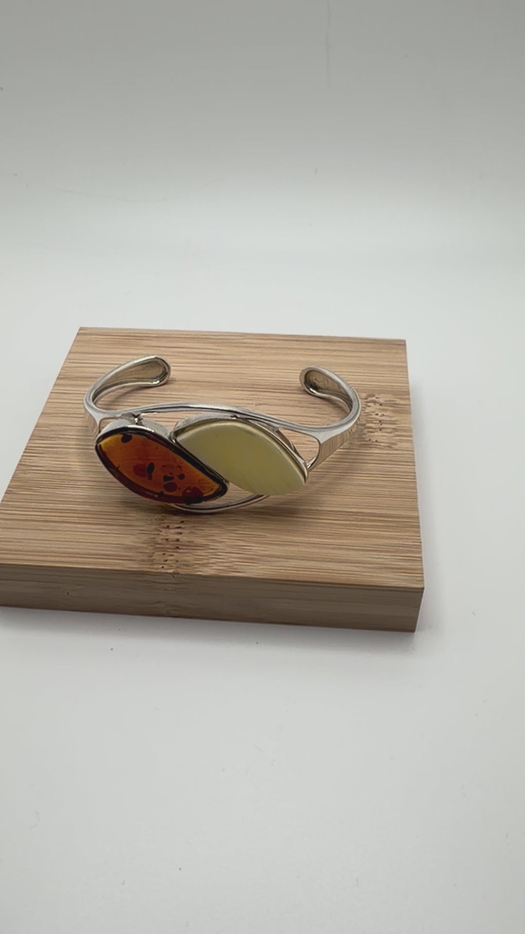 The honey cognac amber cabochon, measuring approximately 15 mm x 30 mm, radiates a warm honey-cognac glow, the butterscotch amber stone measures approximately 15 mm x 30 mm, is a warm yellow butterscotch color with natural inclusions that make each angle mesmerizing. At 24 g total weight, the bracelet carries a bold and luxurious presence while remaining comfortable for wear.
